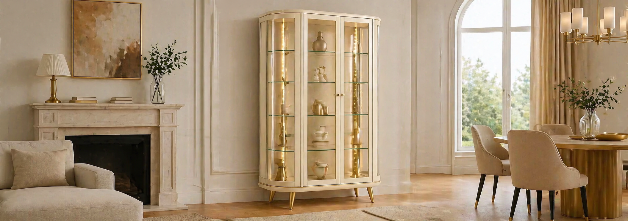 Un rincón lleno de luz y calidez para tu hogar. Esta vitrina en color crema, con sus puertas de cristal, crea un ambiente acogedor donde tus objetos favoritos brillan con luz propia. Perfecta para darle vida a tu espacio con orden y estilo.